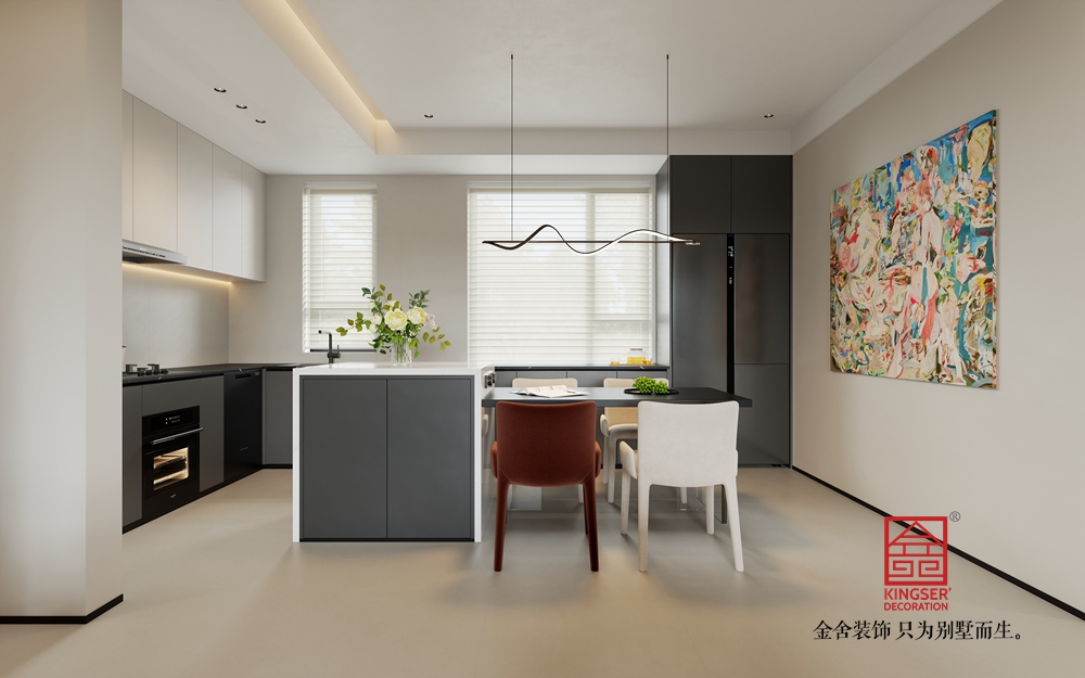 淺米色的大沙發(fā),搭配色彩層次豐富的抱枕,為休憩提供舒適且具美感的載體。黑色圓形組合茶幾,造型簡約又不失設(shè)計感,與整體空間的利落線條相呼應(yīng)。一旁的白色單人沙發(fā),搭著紅色織物,既豐富了色彩層次,又增添了溫馨感,紅色異形休閑椅更是以亮眼色彩和獨特造型,成為空間的點睛之筆,注入藝術(shù)活力。
